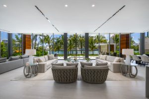 A modern 8,897-square-foot home with seven bedrooms and 8.5 bathrooms and 175 feet of water frontage is listed for $32.9 million by Dina Goldentayer, a real estate agent with Douglas Elliman. The contemporary estate at 6493-6505 Allison Road comes with a mirrored hall with an open concept living space featuring marble waterfall kitchen counters. The property offers eastern exposure for sunset viewing and calm waters to dock a yacht.