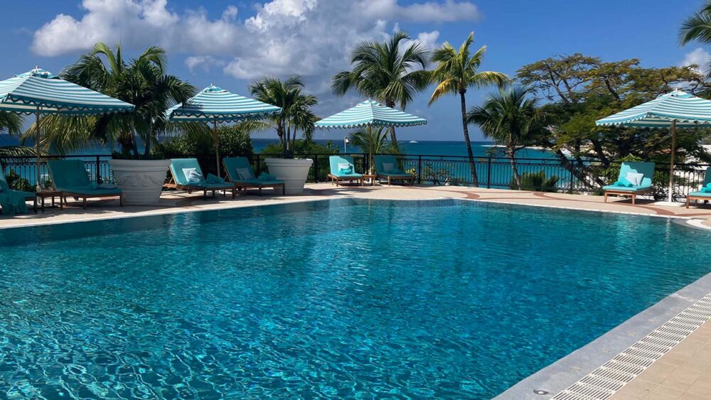 This pool deck is more in the traditional French Riviera style, with scalloped edges and aquamarine lounges, towels and umbrellas that perfectly match the sparkling water.