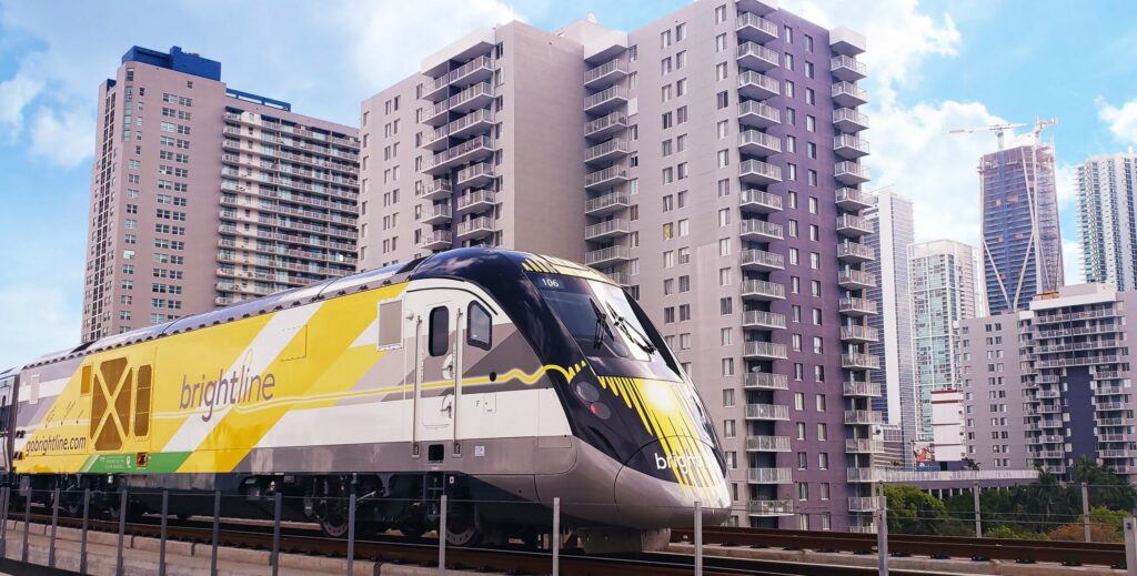 Brightline’s Aventura station has reached a major milestone by installing a 131-foot long, 68-ton pedestrian skybridge on two 41-foot-high vertical transportation towers. Stretching across Harriet Tubman Highway (formally known as West Dixie Highway),