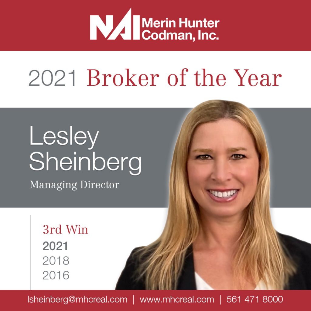 NAI/Merin Hunter Codman, Inc., one of South Florida’s leading commercial real estate firms, named Managing Director Lesley Sheinberg its 2021 Broker of the Year. Sheinberg has completed over 2.5 million