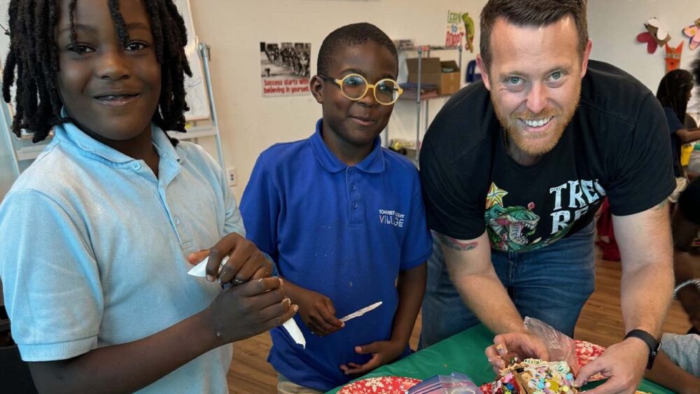 The team dedicated their time and skills to assist children in constructing gingerbread houses.
