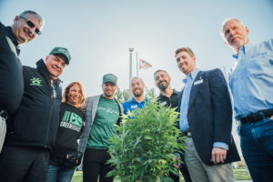 Vice President of Marketing for the Florida Hemp Trade and Retail Association Jeff Greene; Green Roads co-founder Jimmy Tundidor, Director of New Markets Elana Perdeck and co-founder and President of Sales Danny Perdeck with UF/IFAS research team members Sean Campbell, Brian Pearson, Zach Brym and Roger Kjelgren.