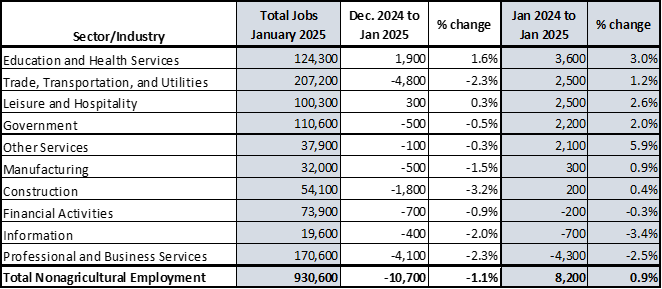 Nonagricultural employment showed a month-to-month decrease of 10,700 jobs with a couple of the sectors gaining jobs month over month: Education and Health Services (+1,900, +1.6%) and Leisure and Hospitality (+300, +0.3%).