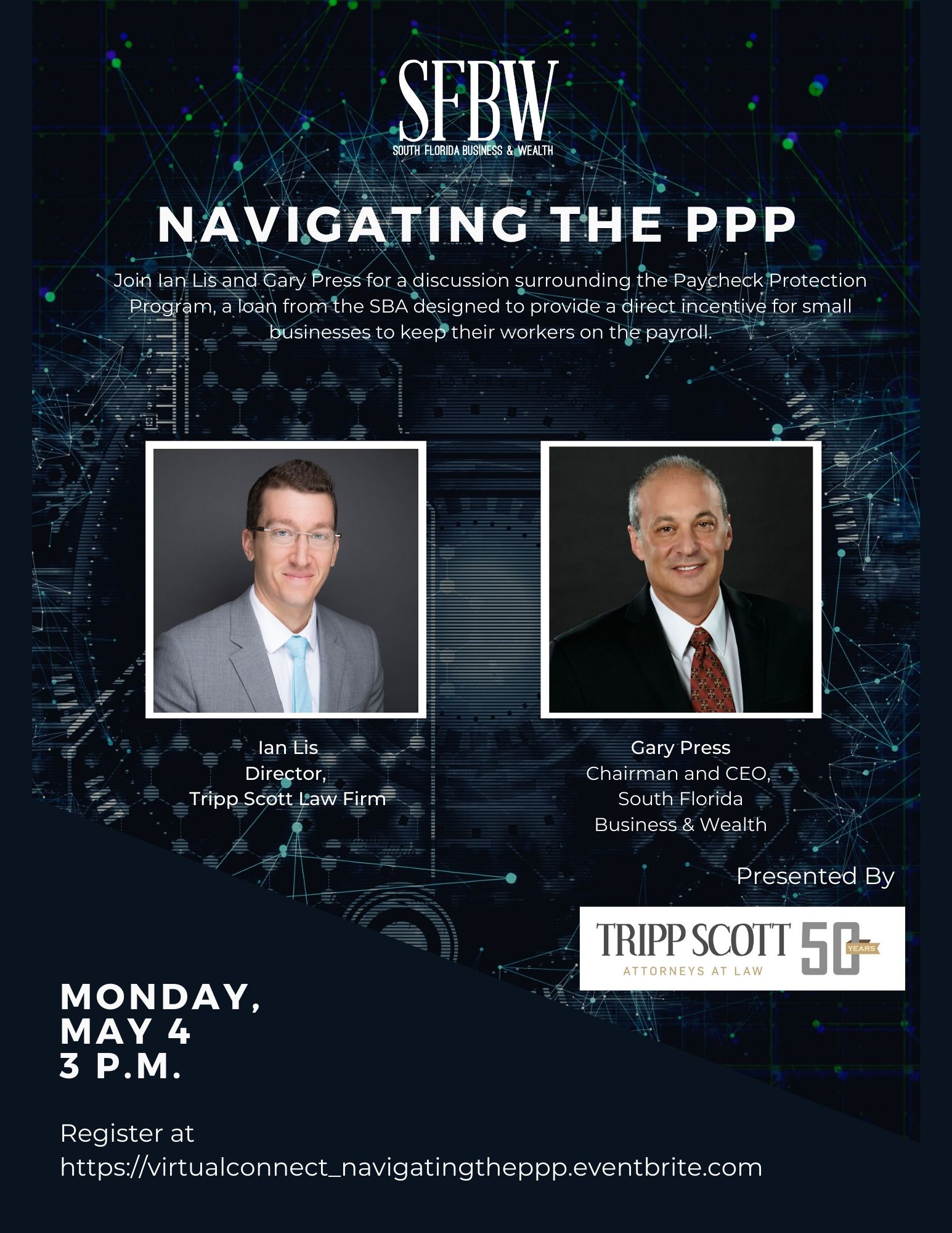 On Monday, May 4th, South Florida Business & Wealth hosted a live Virtual Connect webinar “Navigating the PPP.” Our moderator, CEO and Chairman Gary Press, interviewed Ian Lis of Tripp