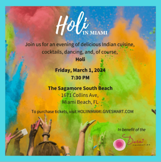 The upcoming Holi event in Miami, hosted by The Desai Foundation, is a distinctive celebration that sets itself apart from the typical Holi festivities. It is a vibrant gathering of like-minded individuals who support a noble cause. The Desai Foundation has invited the community to join them in capturing the essence of this joyous occasion, where the colors of Holi signify not just festivities but also the promise of joy and hope for communities in need.