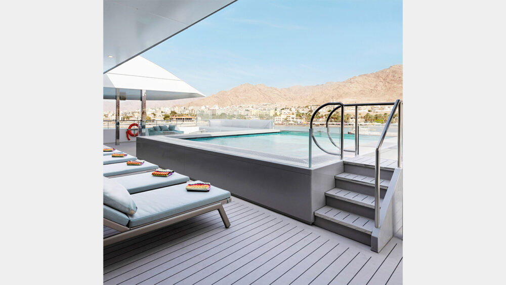 The open-air infinity pool onboard is surrounded by lounge chairs and day beds, offering a perfect place for guests to relax and enjoy a cocktail from the nearby Aqua Café. A wellness deck is also available, complete with a spa, infrared sauna, and gym, allowing guests to focus on their health goals. The top deck Sky Bar is ideal for those looking to watch the sunset. The yacht’s stern boasts a marina platform with abundant water toys, including kayaks, standup paddleboards, snorkel equipment, SEABOBs, and a giant trampoline guests can enjoy when the platform is deployed. The spacious La Cucina dining room specializes in fresh, seasonal cuisine and offers indoor seating and seating on the adjacent terrace. The Amici Lounge is a warm and welcoming place to gather and enjoy live music in the evenings. With 76 crew members on board, guests can expect attentive and personalized service.