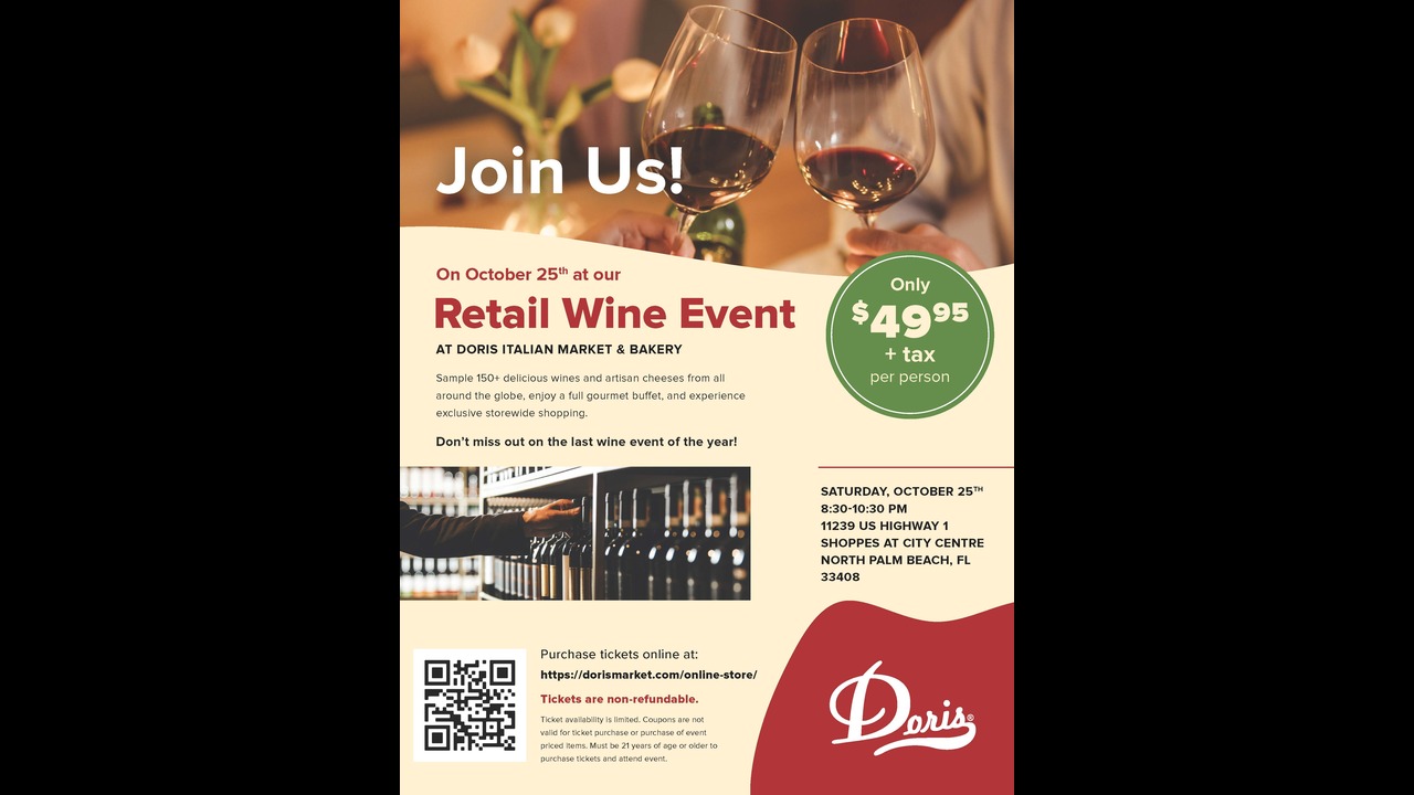 Doris Italian Market and Bakery is hosting a pre-Halloween celebration with a twist. Grab a wine class and go table-to-table to fill that glass with samples of wine from around the globe during Wine Night on Saturday, October 25, from 8:30 to 10:30 p.m. at Doris Italian Market in the Shoppes at City Centre, 11239 U.S. Highway 1 in North Palm Beach.