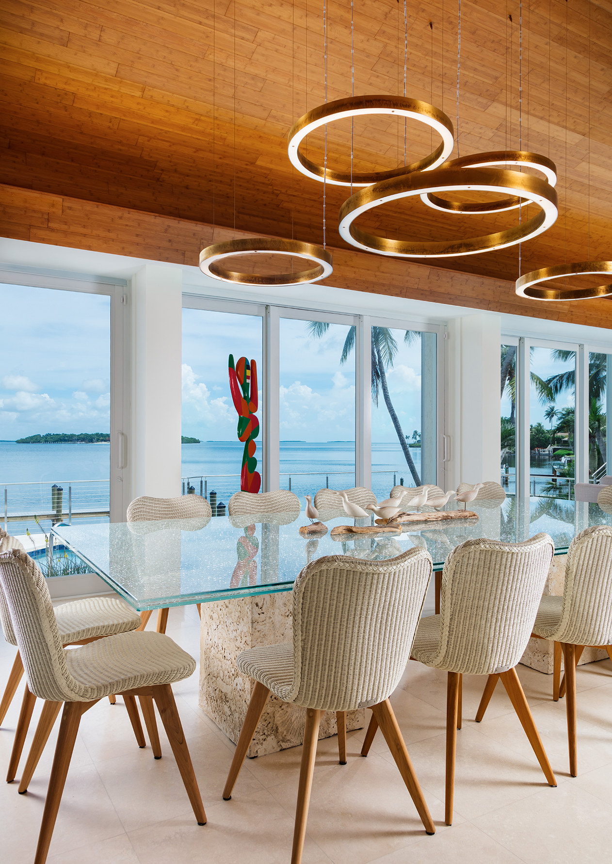 More often than not, Walsh is granted the good fortune of creating a perfect marriage between outdoor and indoor habitats, as was the case with a dining room facing the water for clients at Ocean Reef Club in Key Largo. There she commissioned a custom-made table with a coral base and shattered glass top, which she circled with low-profile outdoor seating from Janus et Cie, and then suspended sculptural LED lights high above from a bamboo ceiling. Walsh knows the classics inside and out, yet here she achieved something loose and light. “We needed to light the dining room without obscuring the view,” she explains. “You want the outside to come in.”