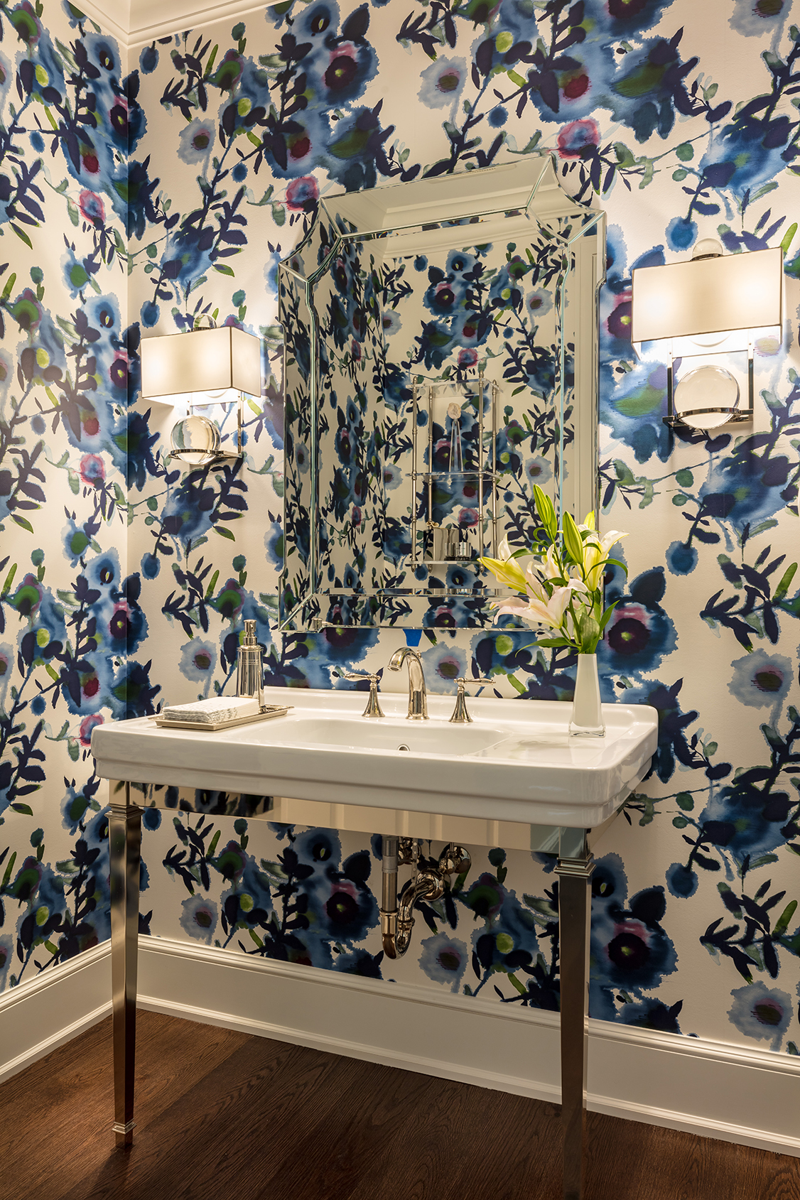 What evolved were intriguing, yet comfortable spaces, including a family room with a Thomas Hartmann painting as its anchor and a wingback chair upholstered in denim, two burnt sienna velvet sofas, and an antique glazed faux finish on the walls. Visitors’ eyes can land on something interesting wherever their gazes fall. “There was a time in design when people used only white,” she recalls. “I was never afraid of color. It’s so easy to put a scheme together when you see how it works in nature.” For reference, see the riotous blue floral wallpaper she chose for a particular powder room in one Jupiter home (“It has a very French feel,” she says. “Open and airy—not fussy.”) and the various shades of green that make an appearance throughout a Lost Tree manse.