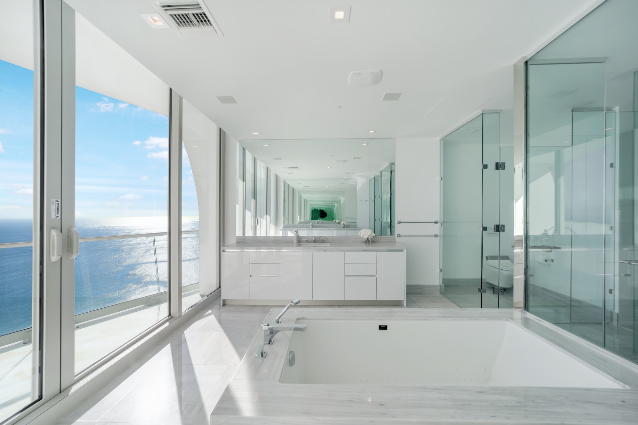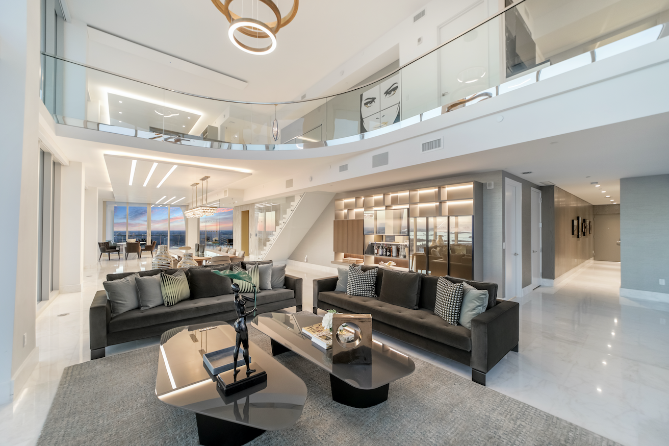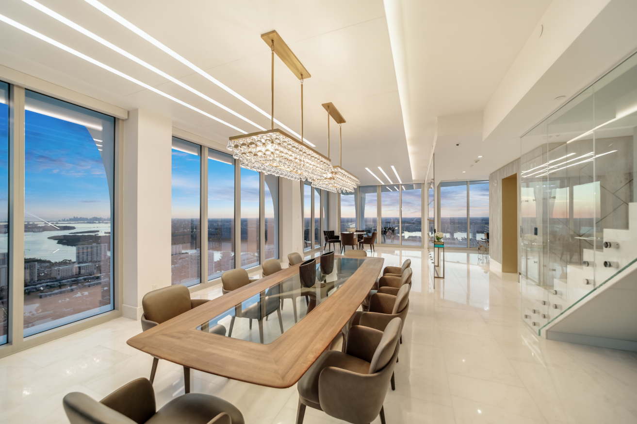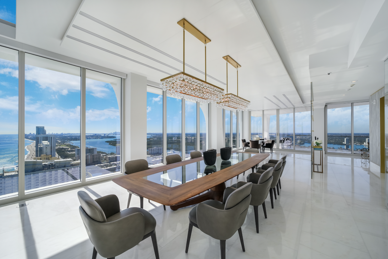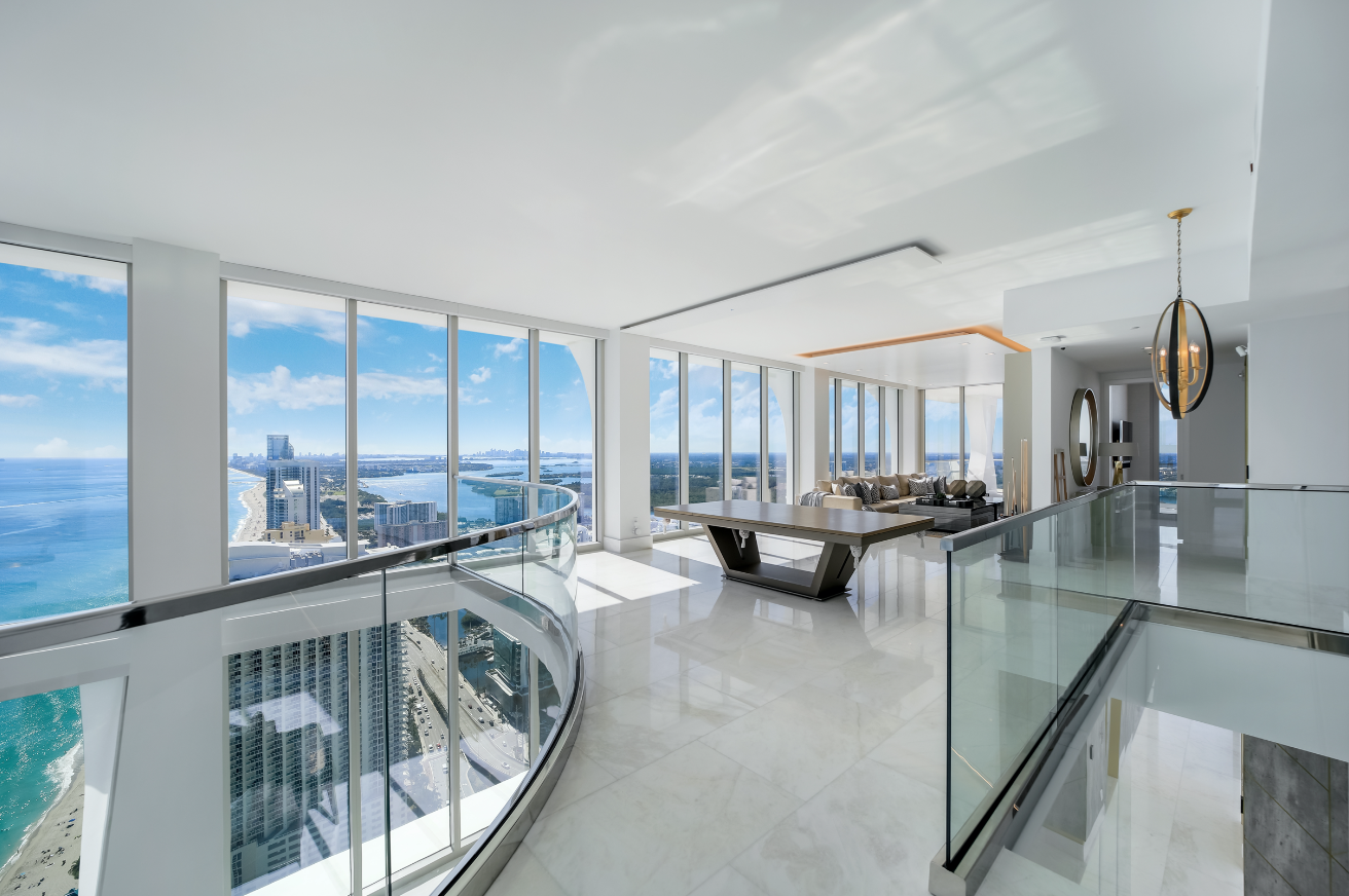 The 2-story unit at 16901 Collins Ave, Sky Villa 5101 at the Jade Signature building is listed for $17.6 million and features 20-foot double height ceilings in the formal living room as well as 270-degree ocean and city views. The turnkey unit on teh southeast corner of the 51 and 52 floors includes five bedrooms and 7.5 bathrooms with 6,735 square feet indoors and 1,161 square feet outdoors. Other features include two offices, white marble floors, private elevator with fingerprint recognition and an open terrace in each room. The unit is also decorated and finished by Vianny Sanguily at Urvan Management and features a Creston system that controls sound, lights, air conditioning, internal cameras, lights and more.