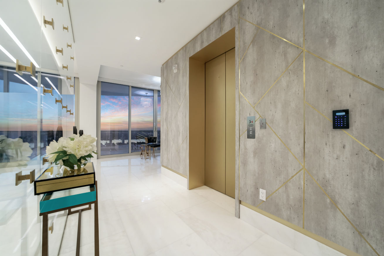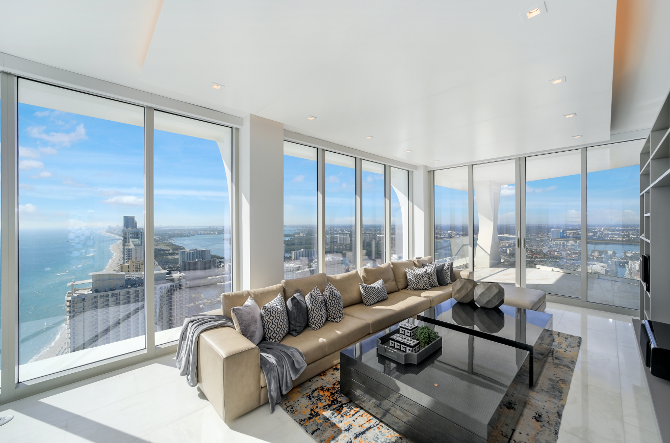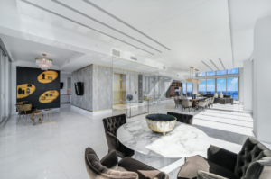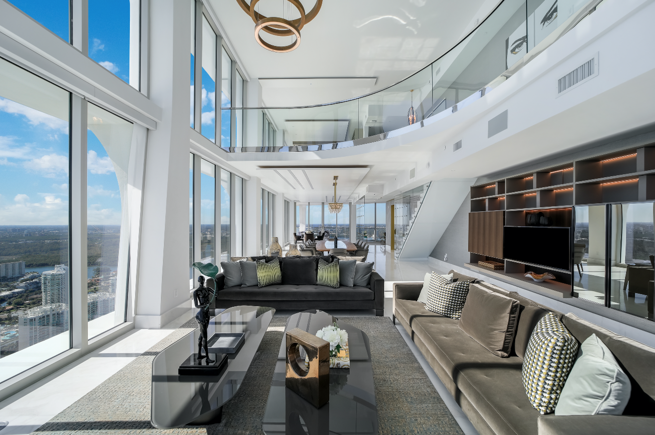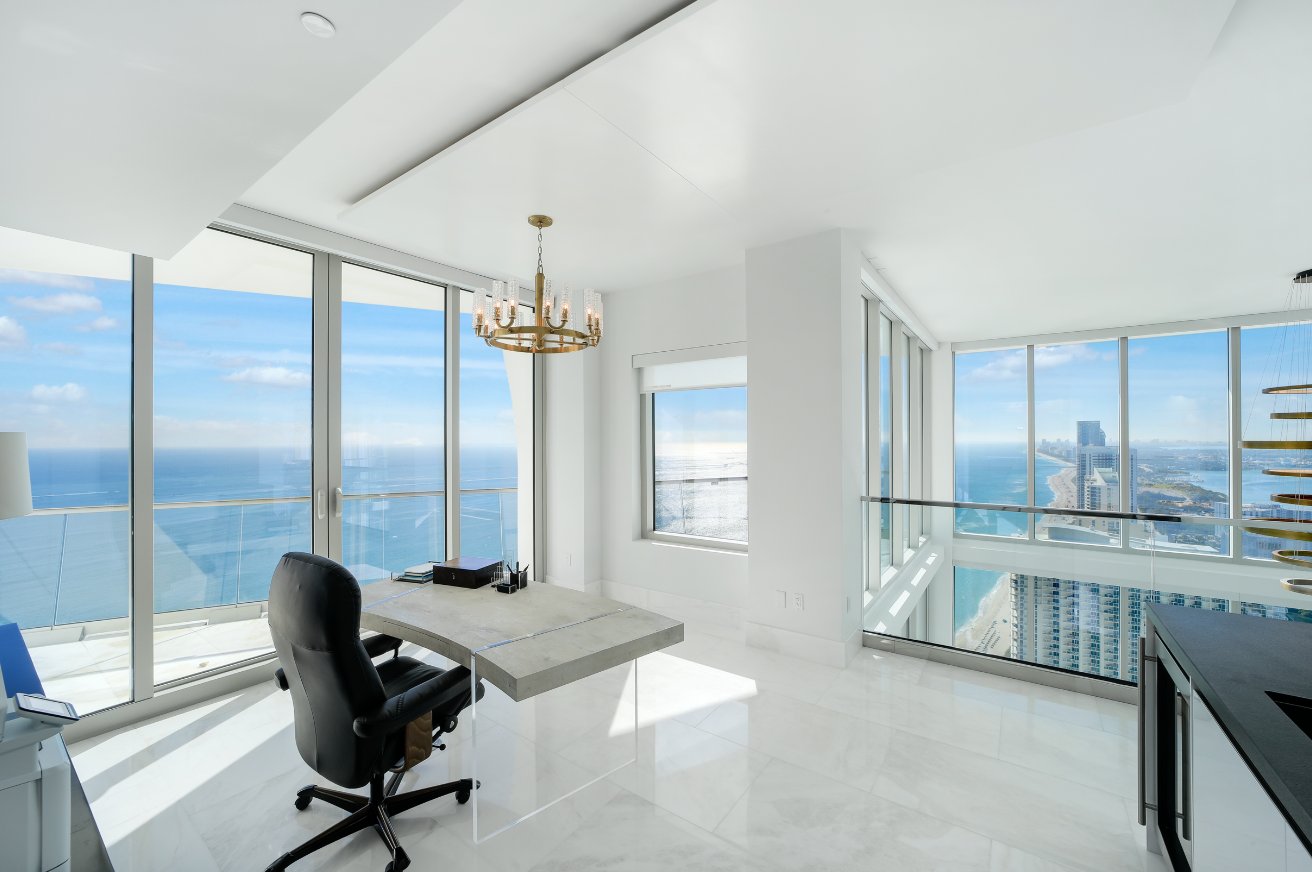 The 2-story unit at 16901 Collins Ave, Sky Villa 5101 at the Jade Signature building is listed for $17.6 million and features 20-foot double height ceilings in the formal living room as well as 270-degree ocean and city views. The turnkey unit on teh southeast corner of the 51 and 52 floors includes five bedrooms and 7.5 bathrooms with 6,735 square feet indoors and 1,161 square feet outdoors. Other features include two offices, white marble floors, private elevator with fingerprint recognition and an open terrace in each room. The unit is also decorated and finished by Vianny Sanguily at Urvan Management and features a Creston system that controls sound, lights, air conditioning, internal cameras, lights and more.