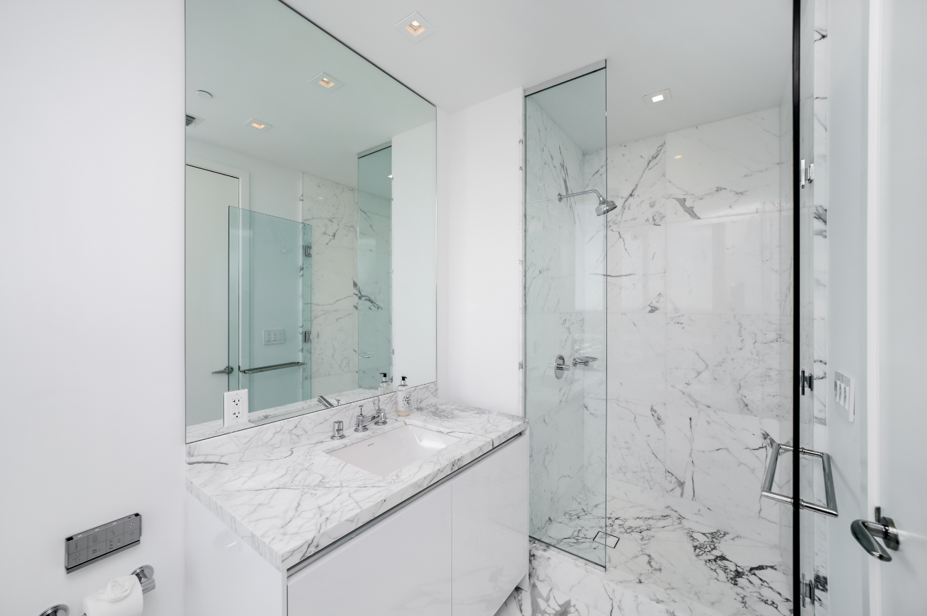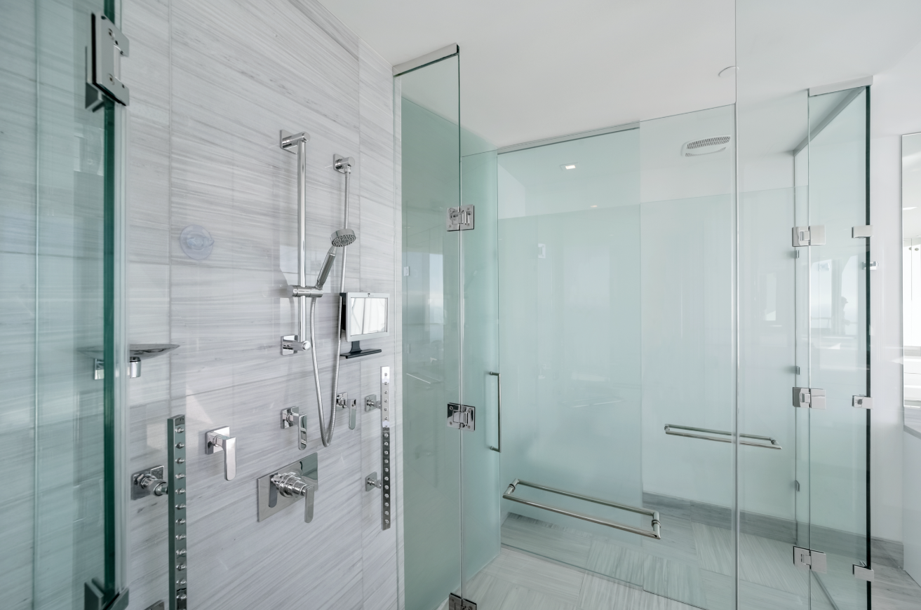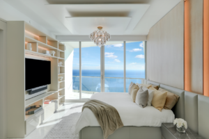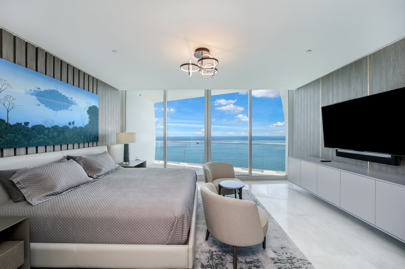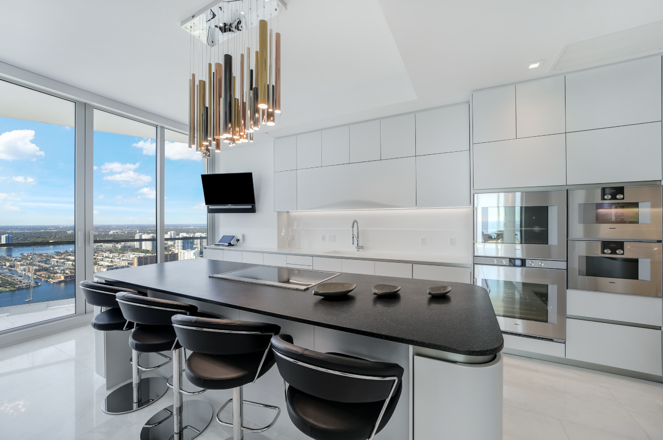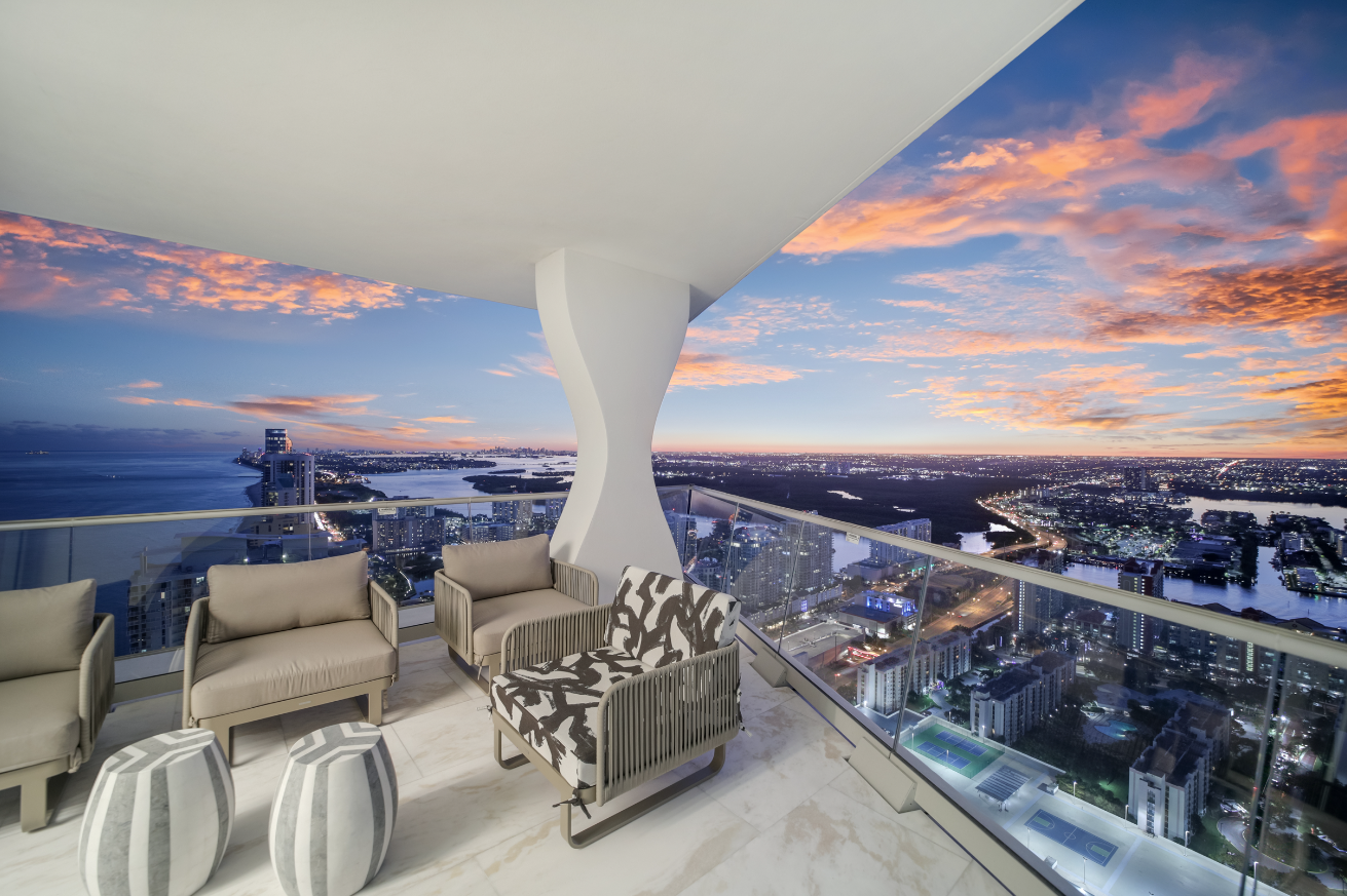 The 2-story unit at 16901 Collins Ave, Sky Villa 5101 at the Jade Signature building is listed for $17.6 million and features 20-foot double height ceilings in the formal living room as well as 270-degree ocean and city views. The turnkey unit on teh southeast corner of the 51 and 52 floors includes five bedrooms and 7.5 bathrooms with 6,735 square feet indoors and 1,161 square feet outdoors. Other features include two offices, white marble floors, private elevator with fingerprint recognition and an open terrace in each room. The unit is also decorated and finished by Vianny Sanguily at Urvan Management and features a Creston system that controls sound, lights, air conditioning, internal cameras, lights and more.