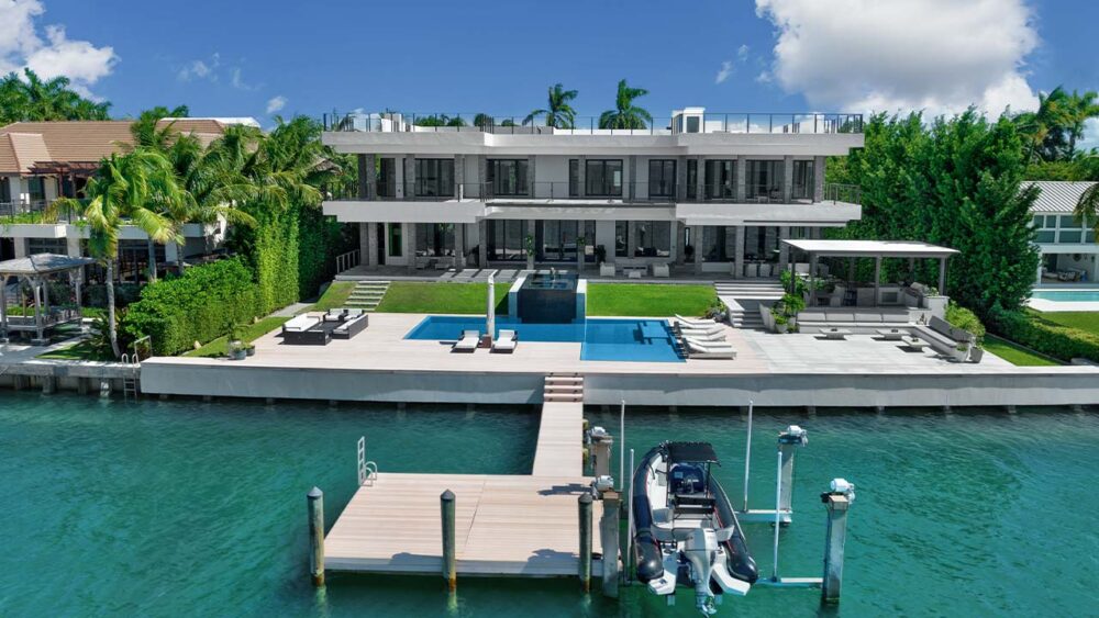 A real estate listing in Key Biscayne at 330 Harbor Drive boasts 120 feet of water frontage directly on Biscayne Bay and a rooftop pickleball court. The estate, listed for $37.5 million, was designed by the world-renowned architect Ramon Alonso from the Miami-based studio Radyca.