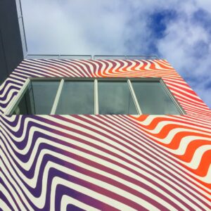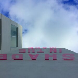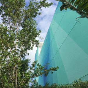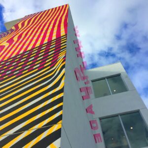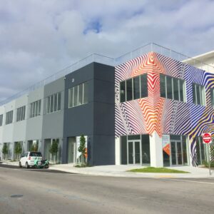 The new HQ is at 2121 Northwest Second Avenue, about three blocks south of Panther Coffee and five blocks from the Wynwood Walls outdoor gallery. The exterior has vibrant stripes and a horizontal signage that casts the shadows of words on the exterior – one example being “made in the shade.”
