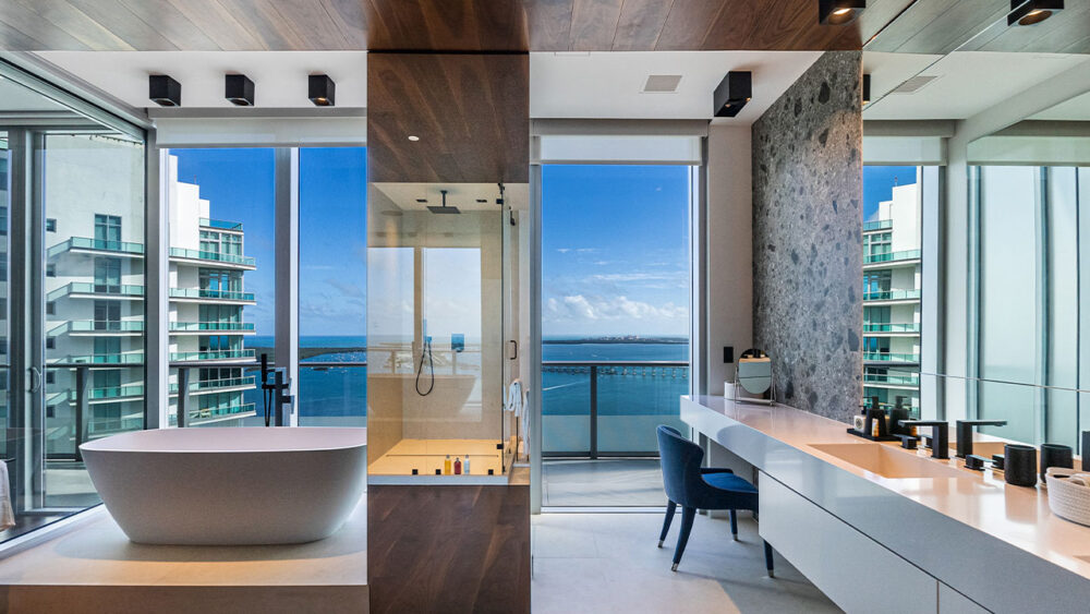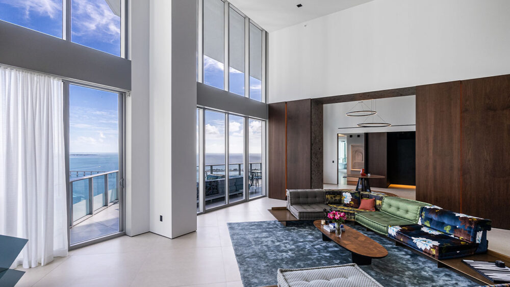 The 44th floor of the building features a 6,500-square-foot penthouse that boasts five spacious bedrooms and seven bathrooms. Upon entering, visitors are greeted by 20-foot ceilings and floor-to-ceiling sliding glass doors that lead to an oversized balcony showcasing stunning views of both the city and Biscayne Bay. The penthouse’s chef’s kitchen is designed with an open-concept layout and is equipped with subzero and Thermador appliances. Additionally, the penthouse features a wine cellar, theater, personal gym, and office space and is fully automated by the Savant System.
