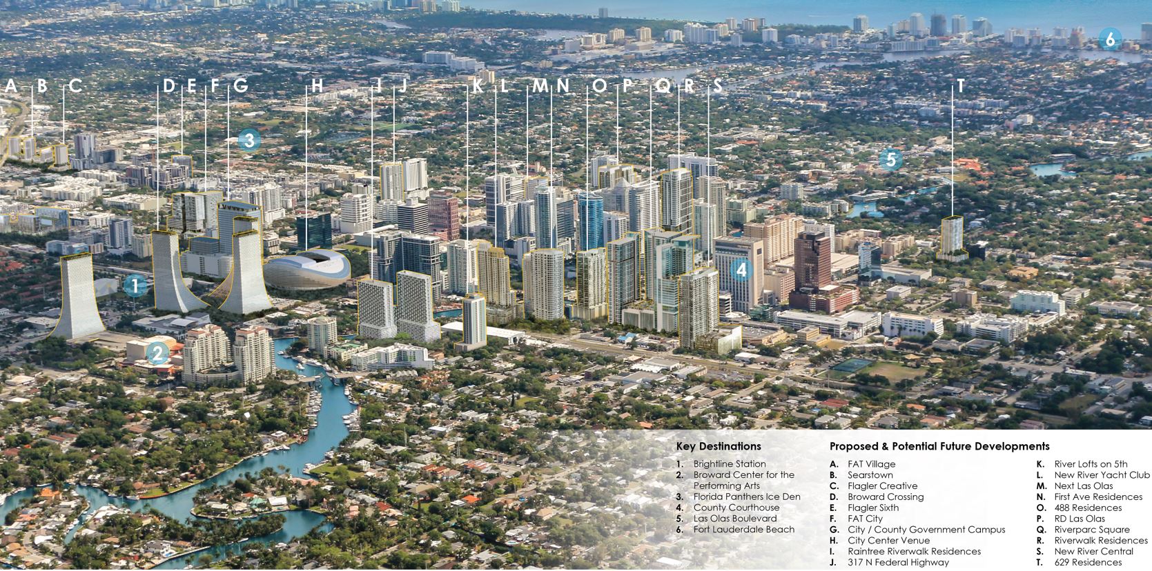With downtown Fort Lauderdale growing and transforming with more high-rise condos and office spaces over the last decade, the Fort Lauderdale Downtown Development Authority (DDA) recently revealed its proposed 2030 skyline for the area. The rendering calls for more than 20 new developments in the urban core with 13,000 new residential units, 600,000 square feet of retail and restaurant, 1.1 million square feet of office space and 1,000 new hotel rooms to be developed over the next 10 years.Â