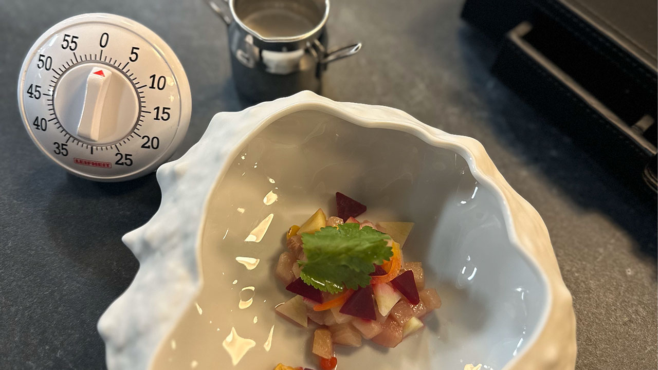 I had also been tipped off: Ken Muskat, the managing director of Scenic Group USA, had raved about Executive Chef Viktor Malek’s wizardry—from the flavors to the interactivity. He told me that we would be prompted to use the little instruments housed inside a literal toolbox, and I was intrigued.