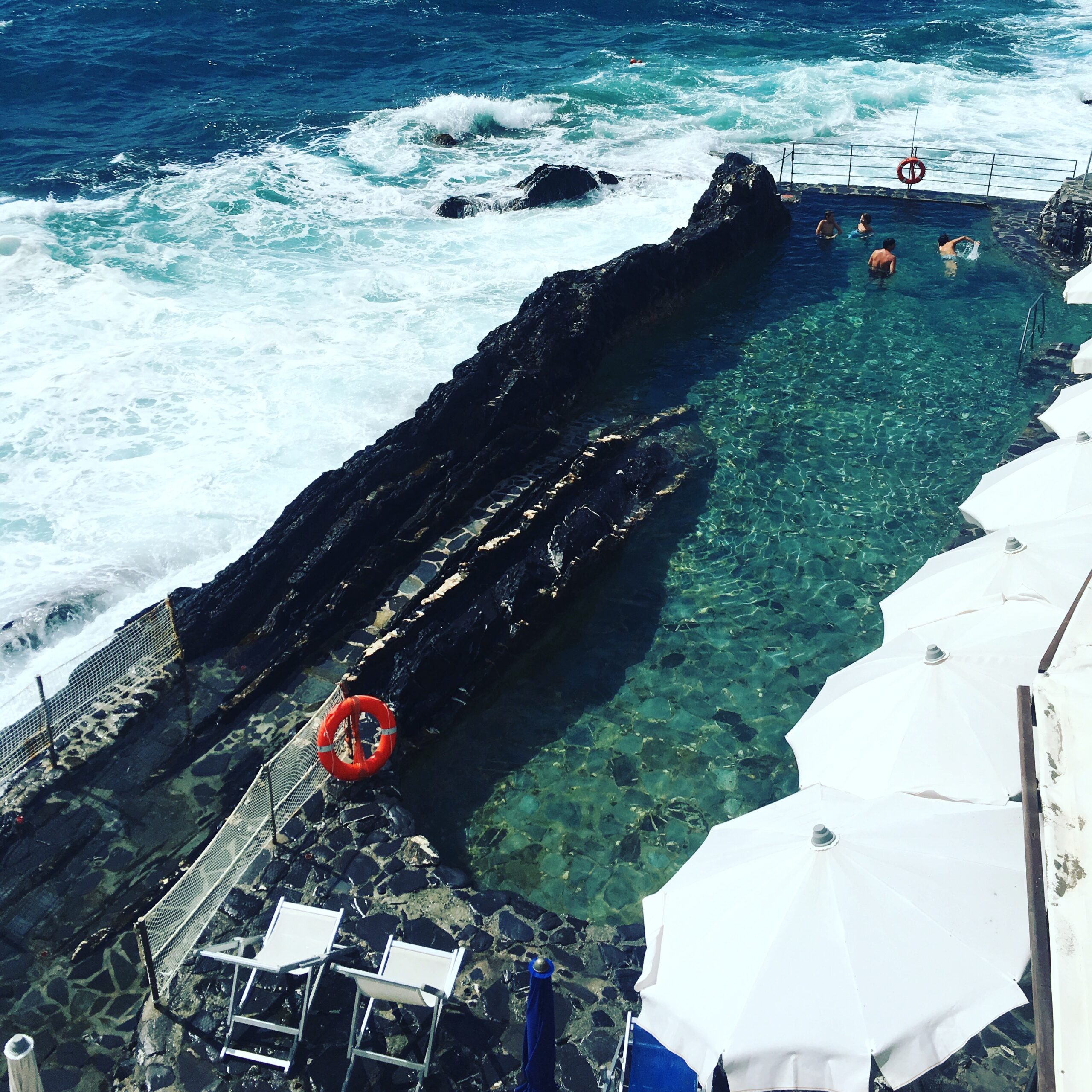 But, looking inland, I saw towering palms and stately villas, so I figured that there must be something to this place. I couldn’t see the water without entering some kind of circular tunnel, which spit me out onto a seaside promenade with gorgeous water views. Thrilled by what my missed stop had led me to, I walked along above the Ligurian Sea. Something told me to keep going, and after about 10 minutes, I happened on a place not just unusual, but for me, a swimmer, astounding.
