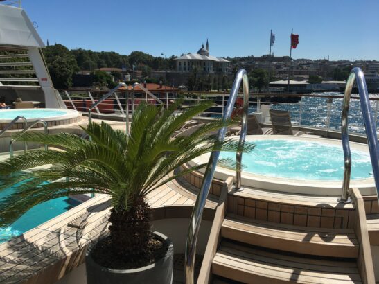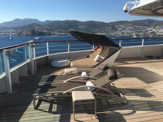When I got back onboard after each day on land, I tended to meander. No rushing to the stateroom to decompress from the stimulation of Turkey or Greece. The diminutive ship—I could see water everywhere—was balm enough. I always found a mostly empty pool or Jacuzzi—perfectly positioned to capture the view—to dunk into. And I happened onto a few hidden Jacuzzis, one at the Retreat, a sanctuary with lavish cabanas; the other at the end of a deserted deck. I learned about the latter when I met a fellow South Floridian, Paul Leone, who happens to be the CEO of the Breakers. Paul told me about the secret Jacuzzi.