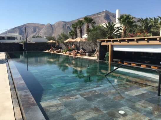We holed up for the a few hours at the Istoria, a member of Design Hotels. The dashing hotel manager, Greg Psillakis, showed us around and then set us up with lounge chairs on the beach under a thatched umbrella. The sea, with its fresh temperature and gentle waves, was perfection. Watermelon smoothies, grilled octopus and fruit trays followed my swim. After a few hours, we moved to the hotel pool, a showstopper clad in the kind of jade-colored tiles you see at pools in Thailand and Bali—this was an Aman-level swimming pool.