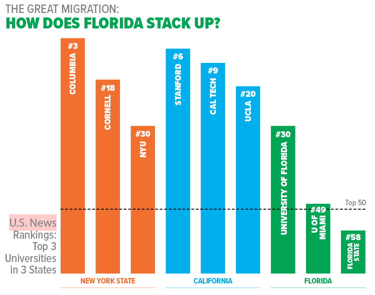 It’s going to take some doing for Florida to catch up. If we look at the U.S. News and World Report rankings and apply an admittedly reductive comparison of just three states—New York, California and Florida—the numbers are revealing. New York State boasts three institutions in the top 30, starting with Columbia University sitting at #3, with Cornell and New York University also in the mix. The Golden State, meanwhile, has three schools within the top 20 and six within the top 30, with Stanford at six and the state’s stellar university system accounting for no less than three top 30 slots (UCLA, UC Berkeley and UC Santa Barbara).